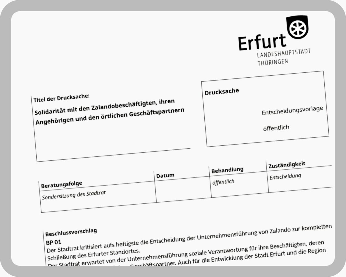 Linke und SPD haben für einen Termin in zwei Wochen eine Sonderstadtratssitzung beantragt. “Solidarität mit den Zalandobeschäftigten, ihren Angehörigen und den örtlichen Geschäftspartnern” lautet die Überschrift ihres gemeinsamen Antrags. Dies ist billig, wohlfeil und vor allem wirkungslos. Es weckt eine Erwartungshaltung bei den Beschäftigten von Zalando, die nicht zu erfüllen ist. Bereits in der Ältestenratssitzung am Montag habe ich meine Meinung dazu deutlich gesagt.