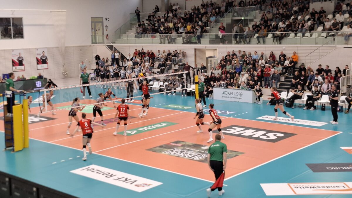 Symptomatisch startete die Partie vor großer Kulisse in der Riethsporthalle, darunter knapp 100 lautstarke Gästeanhänger. Dresden, das mit seinem Stammsechser auflief, wollte keine Zweifel aufkommen lassen, wer am internationalen Frauentag Chefin im Ring ist. Eine 8:1-Führung stellte frühzeitig die Weichen. Erfurt fing sich zwar etwas, aber nach dem vierten Satzball, verwandelt von Jette Kuipers, stand ein 15:25 auf der Anzeigetafel. Im zweiten Durchgang blieb Schwarz-Weiß bis zum 7:9 auf Schlagdistanz, jedoch sorgte eine starke Aufschlagserie von Amanda Siksna zum 7:16 wieder für deutliche Verhältnisse. Spätestens hier war jedem in der Halle klar, Erfurt würde den Gästen nicht das Wasser reichen können. Zu stark die Aufschläge des DSC, zu wackelig die Erfurter Annahme. Am Netz verteilte die spätere MVP, Emma Grome, die Bälle nach Belieben, was sich in der ausgeglichenen Punktestatistik aller Angreiferinnen widerspiegelt. Lorena Lorber Fijok machte den Sack zum 25:12 zu.
