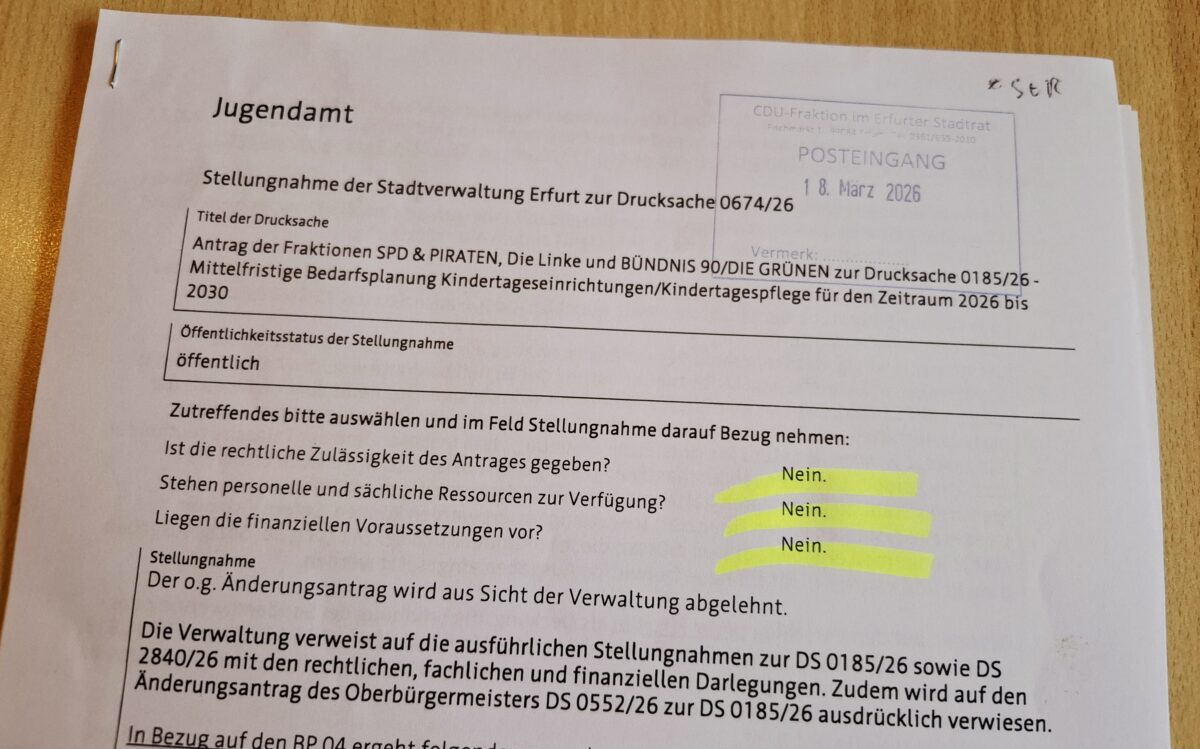 Naivität oder Unkenntnis? Ich glaube beides nicht. Es ist ganz offensichtlich Vorsatz und es ist auch ganz offensichtlich einkalkuliert, dass im Ergebniss Frust und Entäuschung produziert wird. Gestern Abend hat der Erfurter Stadtrat nach längerer Diskussion ein sogenanntes Kita-Moratorium beschlossen.